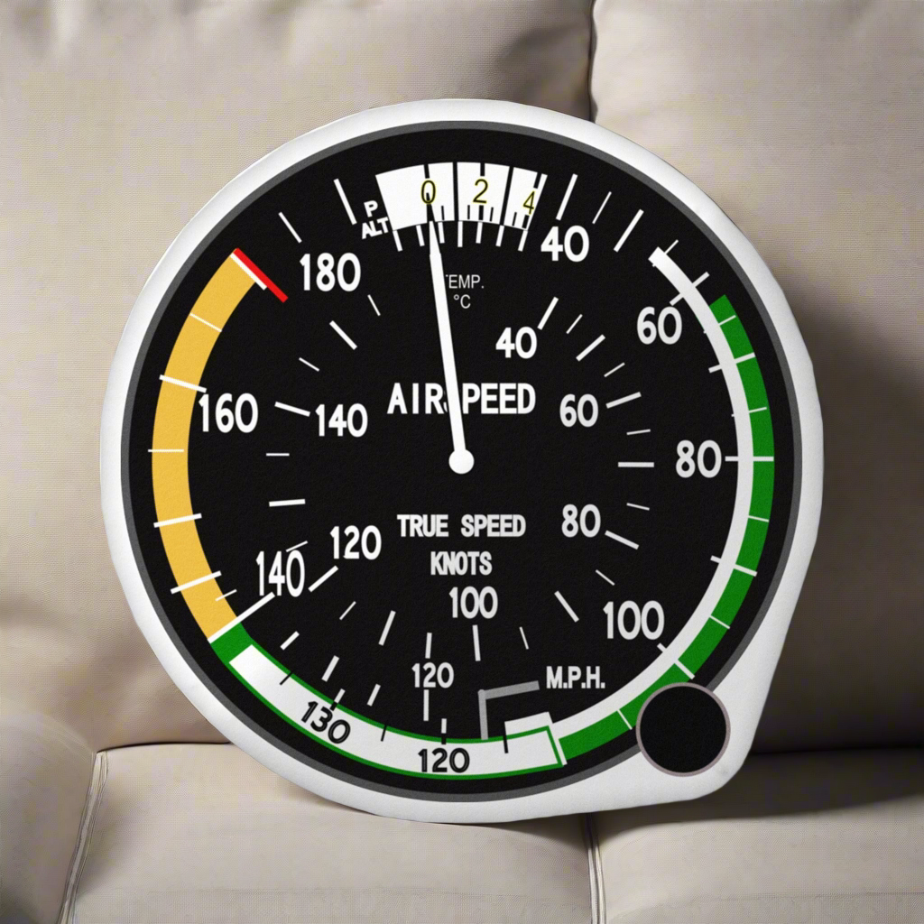 Tired of boring throw pillows? Cruise into comfort with this airspeed indicator pillow that says, “I sleep at Vne.” Whether you’re a couch captain or a certified nap jockey, this pillow is your ticket to true airspeed dreams. Comes complete with colorful arcs, unnecessary temperature readings, and enough aviation nerd appeal to keep the FAA mildly concerned.